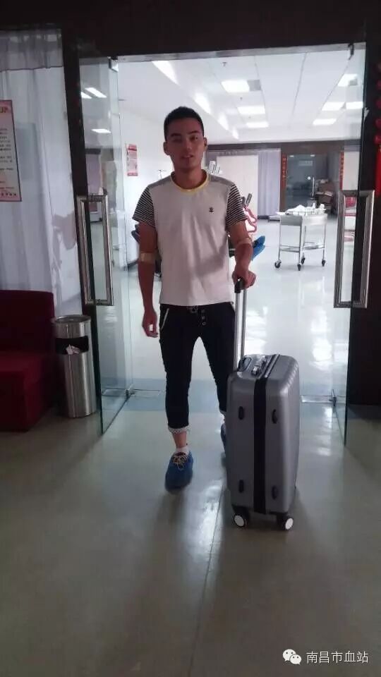 今天,给大家介绍的这位献血者叫:赵志伟,就读于江西司法警官学院。当我们看到他的时候,他正拧着行李箱走进我站机采大厅。他说,他马上就要坐火车去深圳实习一年,所以提早来血站献血,以后回南昌他还会将献血继续下去。