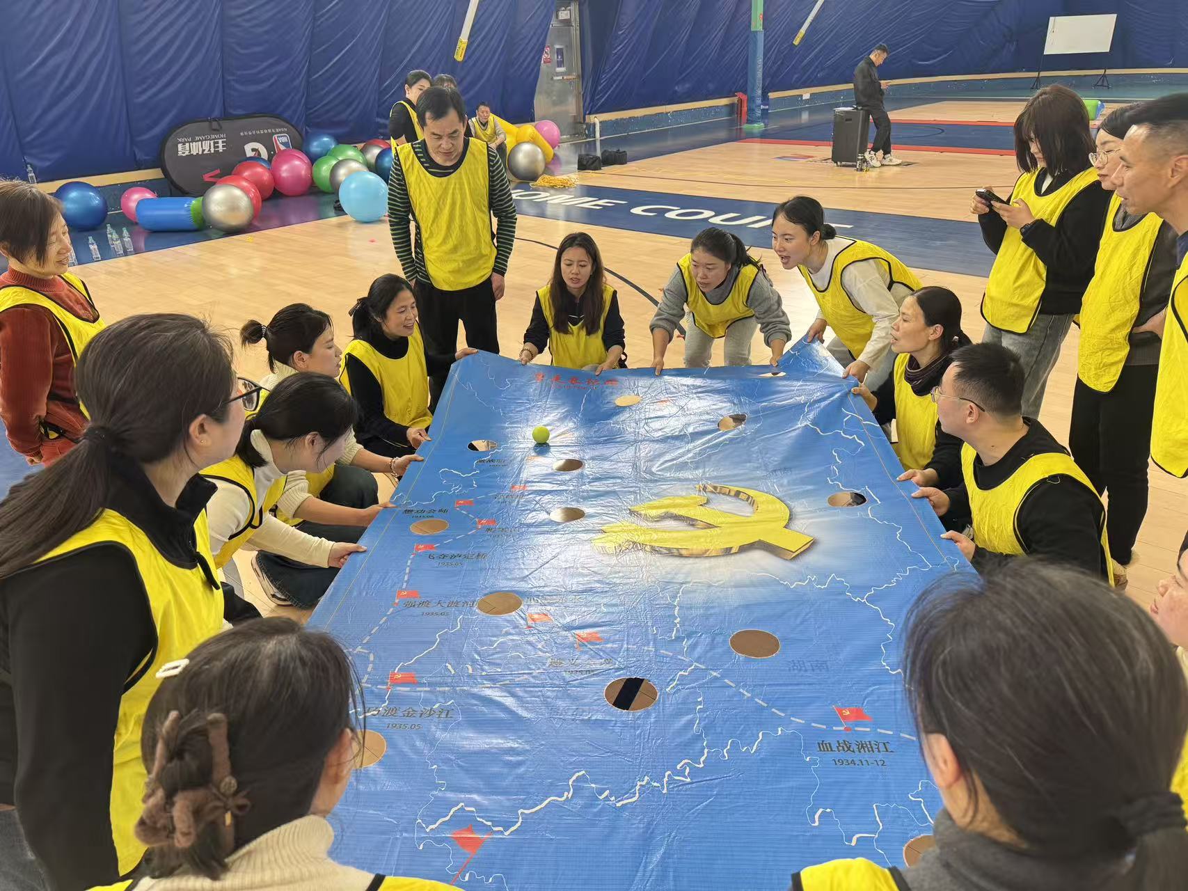 活动在欢快的气氛中拉开帷幕。考验反应能力的口令游戏和暖场小节目让大家笑声不断。游戏环节分三个小队进行比拼。每支队伍都精心设计了自己的队名、口号和专属动作,展现出各具特色的团队风采。“一锤定音”“合力铸塔”“重走长征路”等趣味横生的项目,更是将团队合作的精神发挥得淋漓尽致。